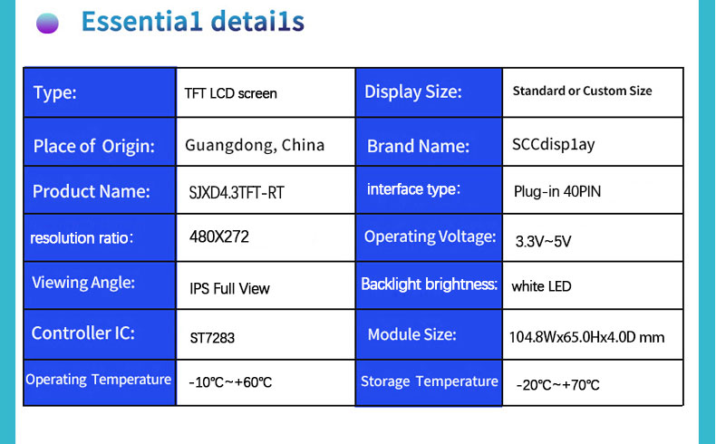 4.3 TFT screen offering high-resolution color visuals, angles de vision larges, strong brightness, and optional capacitive or resistive touch. Designed for embedded systems, électronique grand public, and industrial interfaces, it delivers reliable performance, réponse rapide, and stable operation in diverse environments.