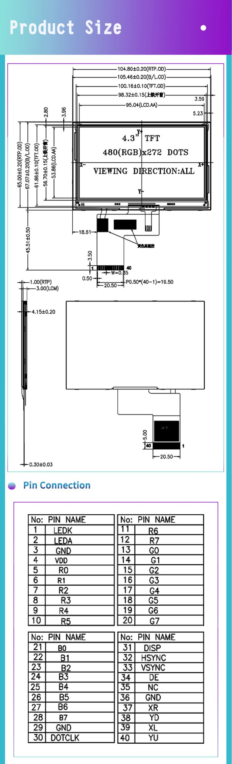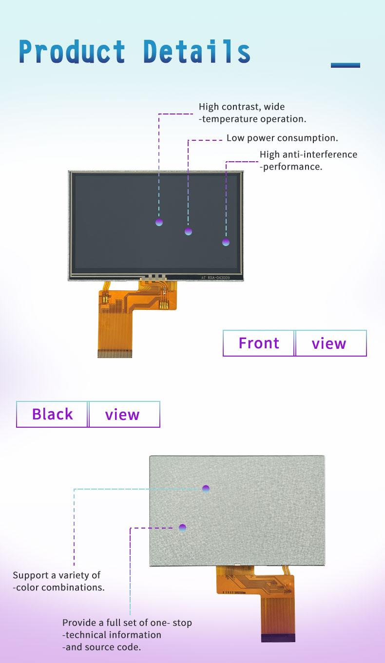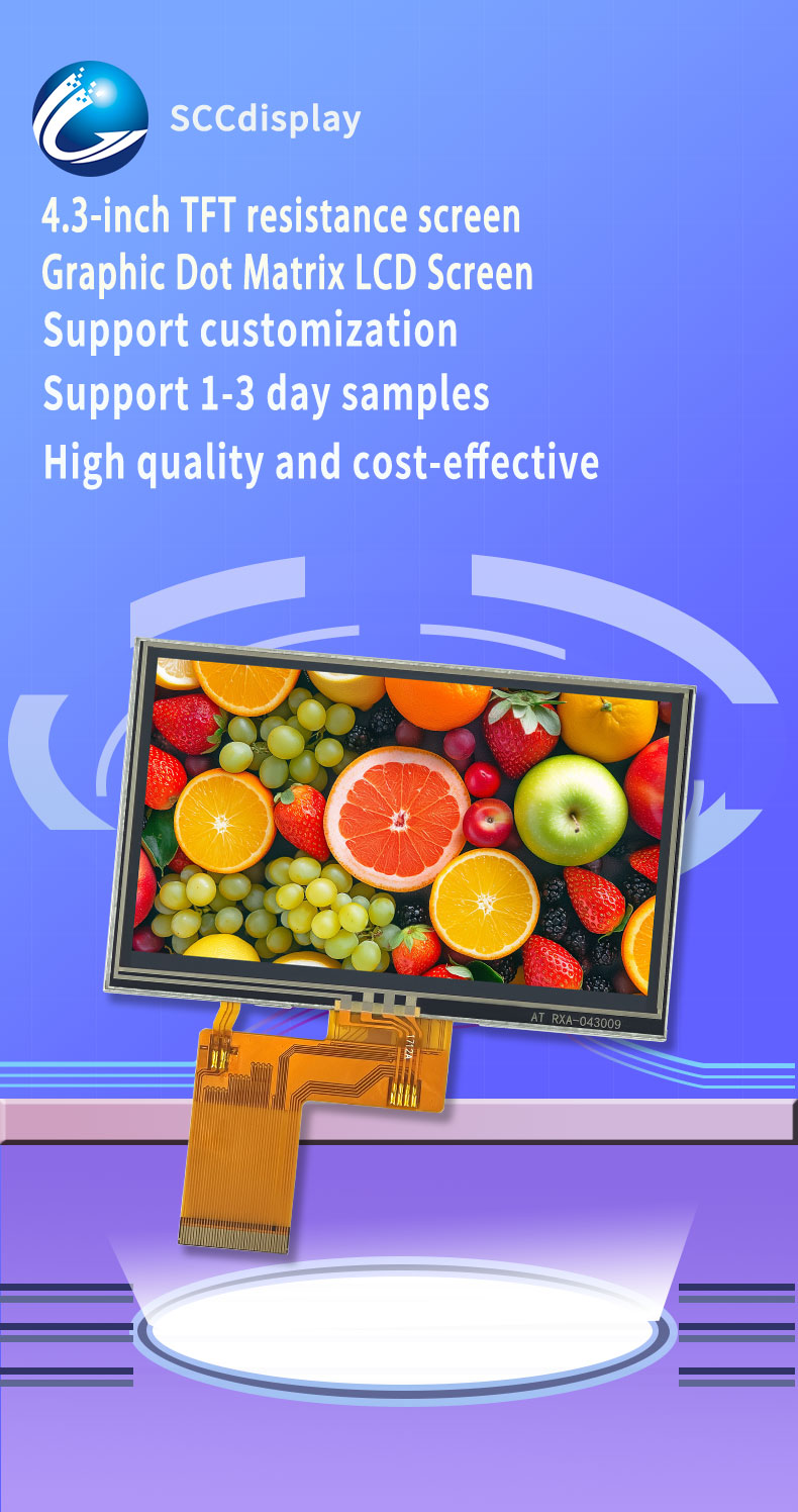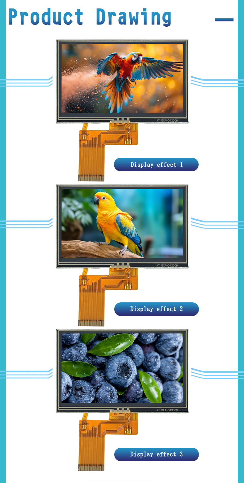 4.3 TFT screen offering high-resolution color visuals, angles de vision larges, strong brightness, and optional capacitive or resistive touch. Designed for embedded systems, électronique grand public, and industrial interfaces, it delivers reliable performance, réponse rapide, and stable operation in diverse environments.