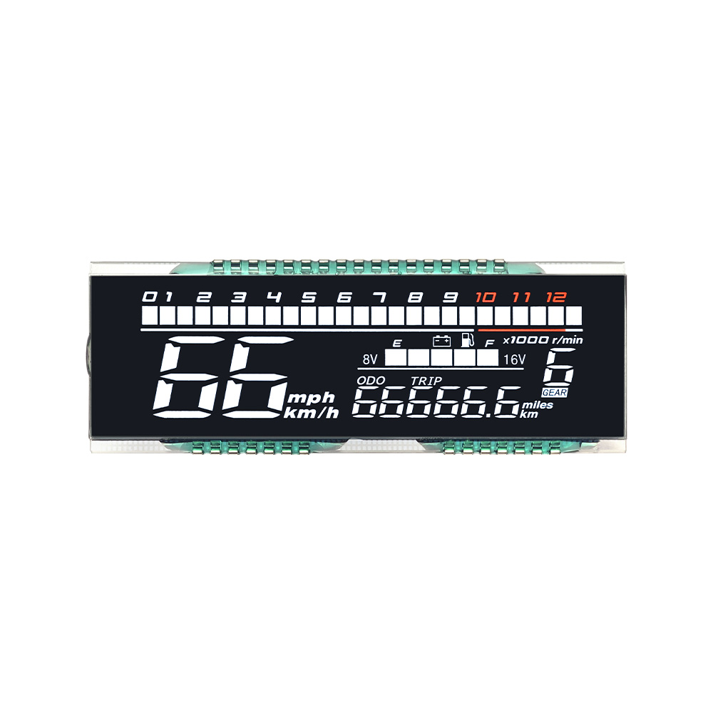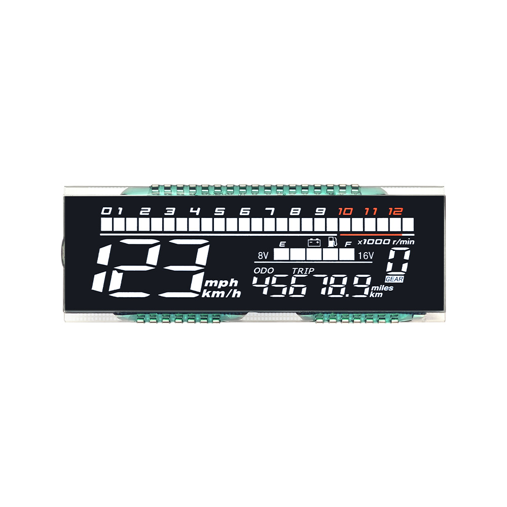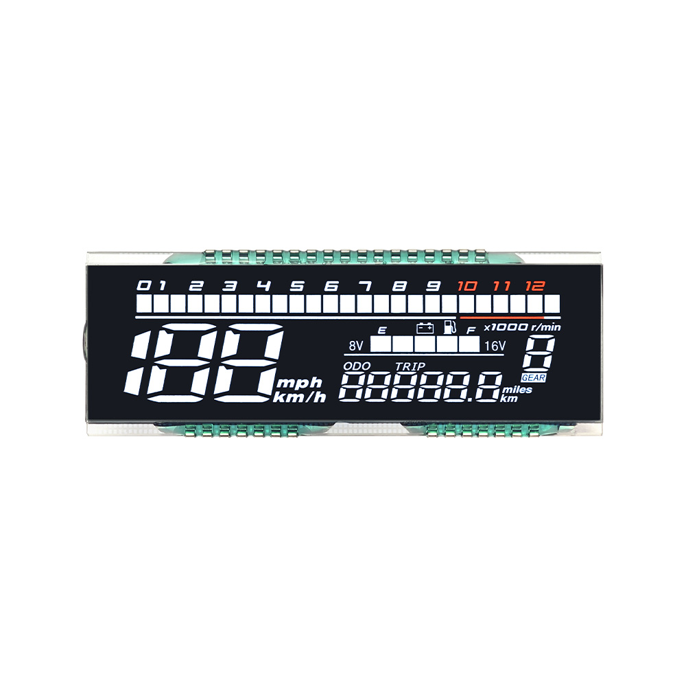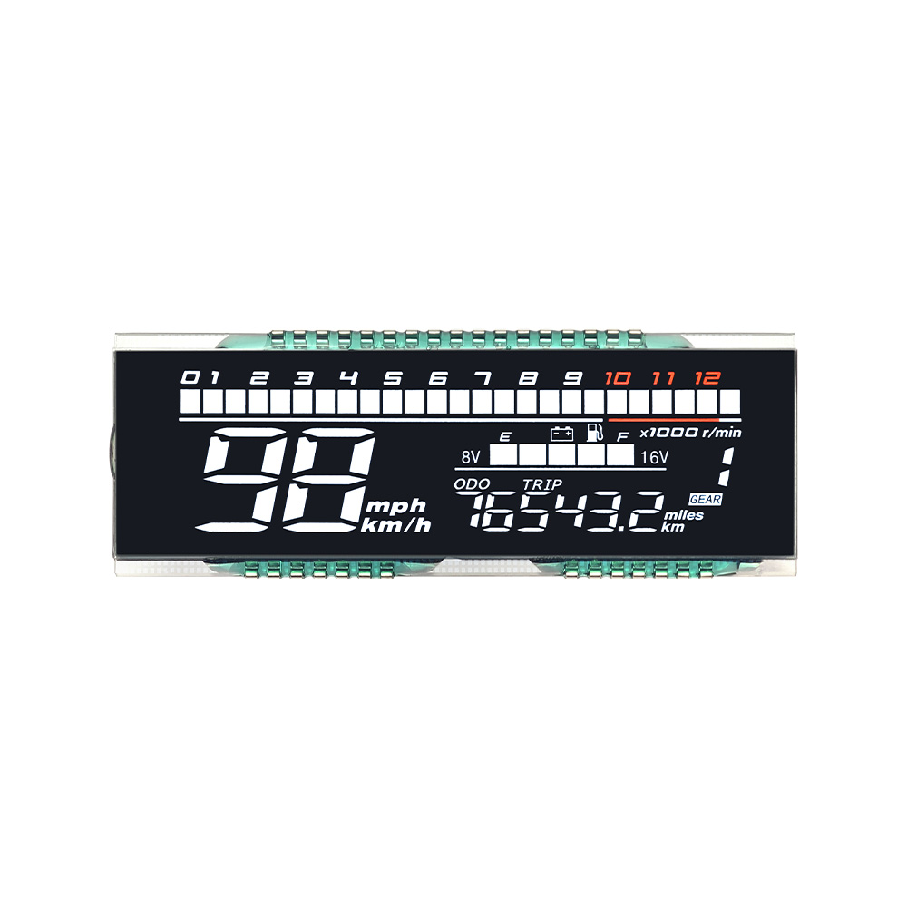 Motorcycle LCD segment is a custom segmented display designed for dashboards, showing speed, niveau de carburant, gear position, and warning indicators with high visibility and low power consumption.