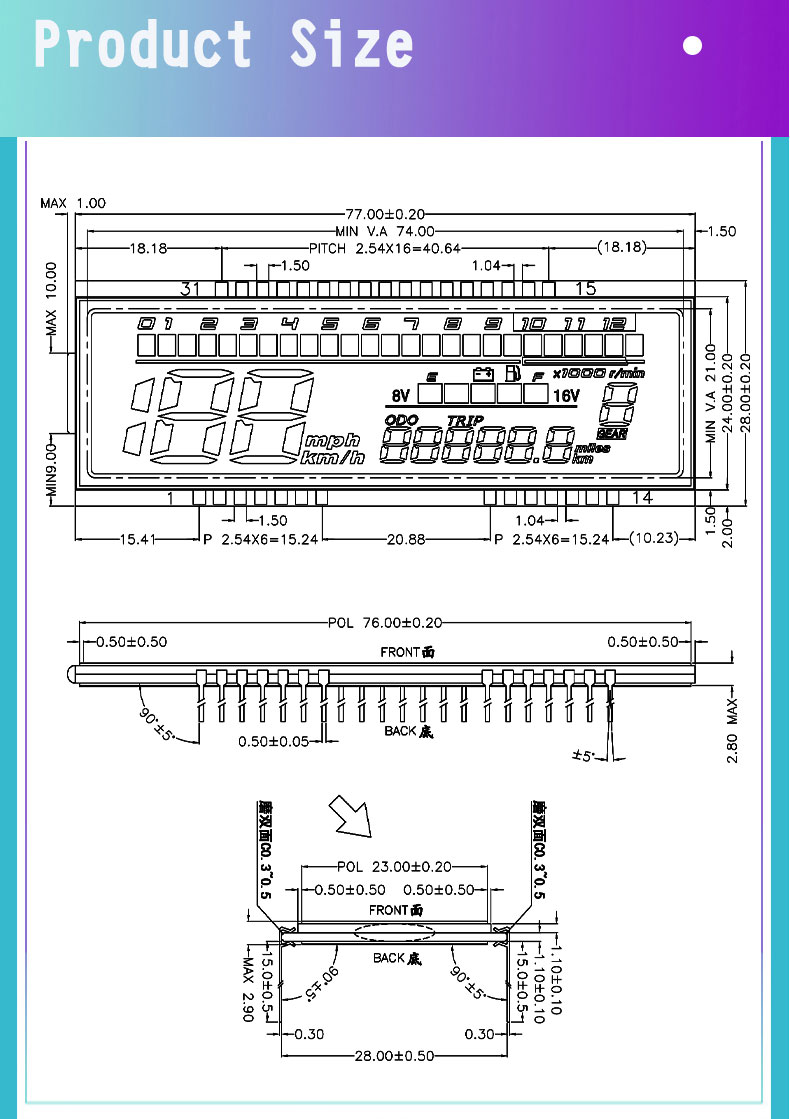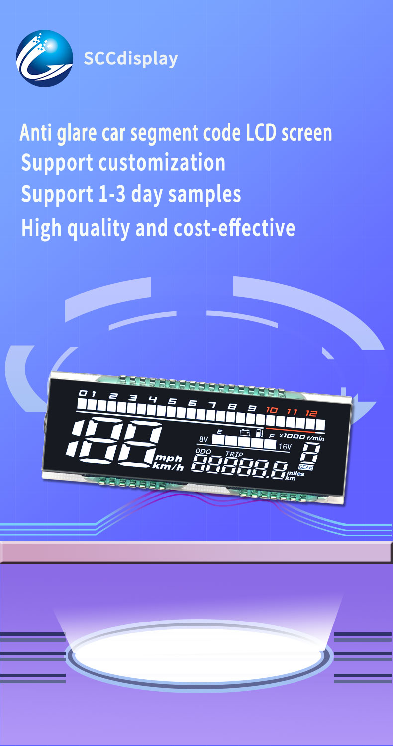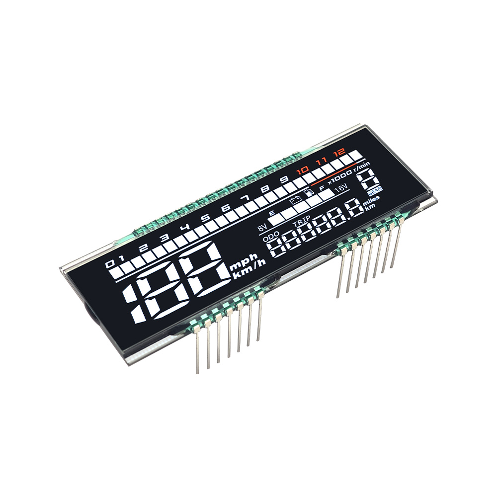 Motorcycle LCD segment is a custom segmented display designed for dashboards, showing speed, niveau de carburant, gear position, and warning indicators with high visibility and low power consumption.