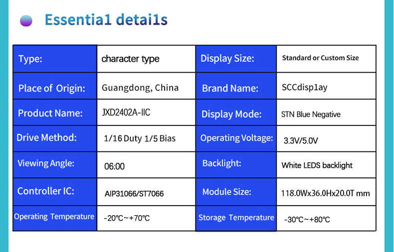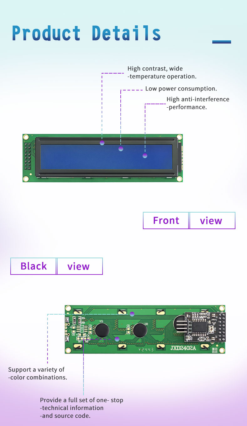 IIC 24×2 Character LCD module is designed for projects requiring a simple and efficient display solution. With 2 行と 24 行ごとの文字数, it provides ample space for displaying text or data. This module uses an I2C interface, which can easily connect to a microcontroller and save wiring space