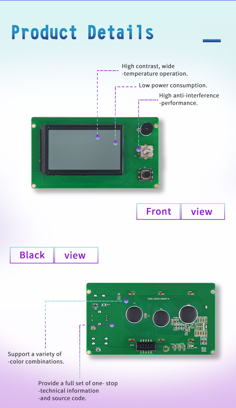 12864 LCM Module features a 128×64 monochrome dot matrix display with clear contrast, low power consumption, stable performance, and long service life. wide viewing angles, and reliable operation, making it ideal for industrial control, instruments, and embedded systems.