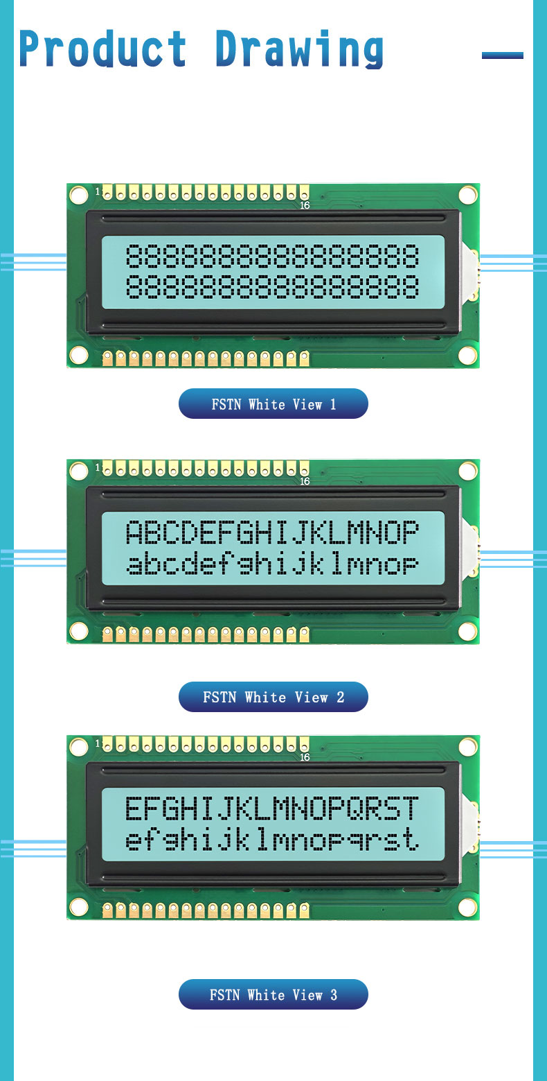 Character 16×2 Display provides two rows of 16 characters for clear text output, offering high contrast, wide viewing angle, and stable performance. It features low power consumption, simple control commands, and is widely used in industrial control, instruments, and embedded systems.
