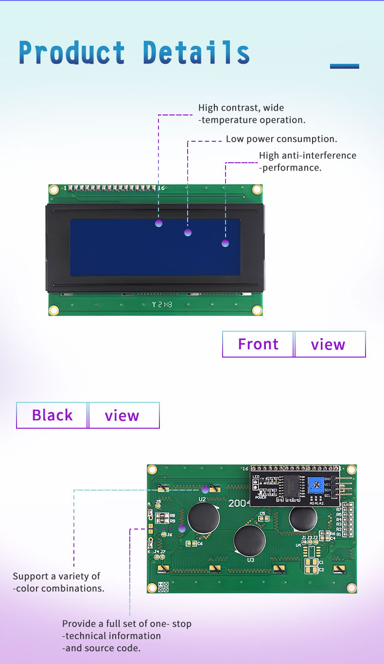 IIC Character LCM Module delivers stable performance with a compact layout, offering clear alphanumeric display, wide viewing angles, and low power usage. It supports simple IIC communication for efficient data transfer, enabling easy integration into microcontroller-based designs. Ideal for industrial controls, instrumentation, and compact embedded applications requiring reliable text visualization.